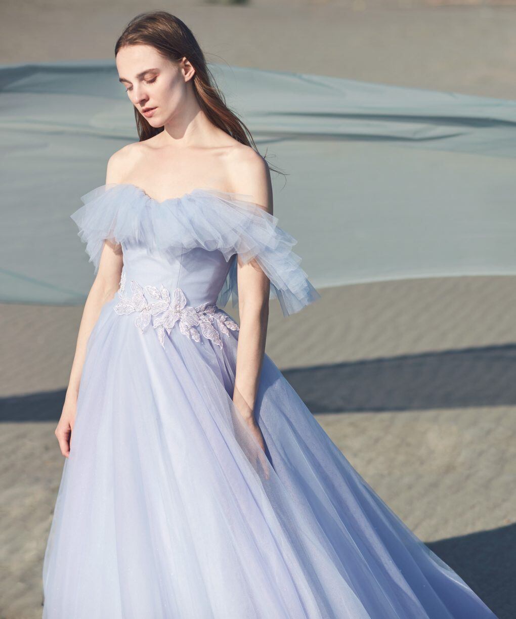 ウェディングドレス 紫青 透明感 オフショルダー 女性らしさチュールスカート 花嫁/ウェディングドレス