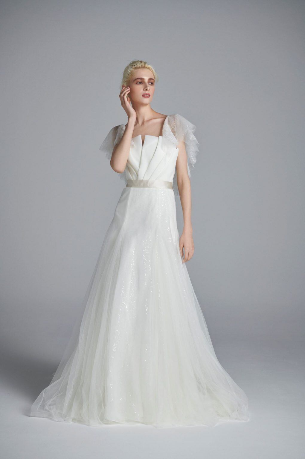 ウェディングドレス ホワイト ふんわり袖 背中見せ ロングトレーン エレガント 花嫁/ウェディングドレス