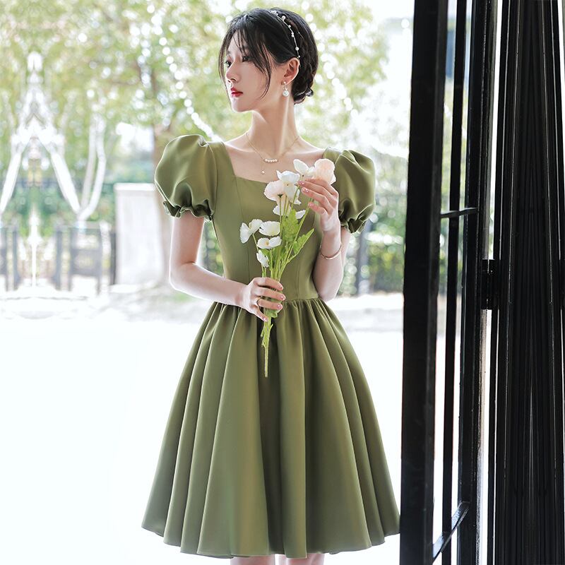 ミニドレス グリーン フランス風 パフスリーブ スクエアネック 合コン/デート