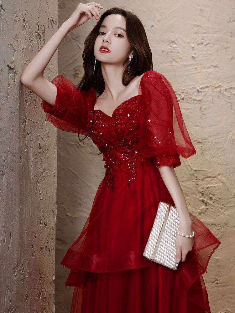 パーティードレス ワインレッド 半袖 優雅なシルエッ スクエアネック/ オフシェル お呼ばれ/二次会