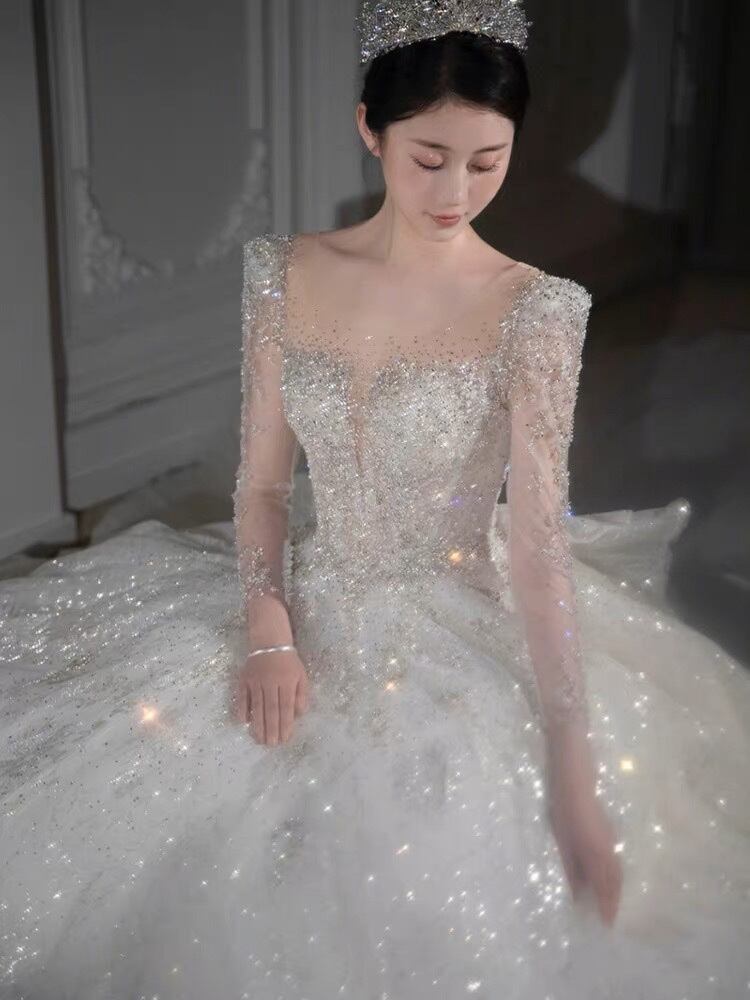 ウェディングドレス ホワイト フランス風 トレーン スクエアネック 長袖 クラシック風 結婚式/披露宴