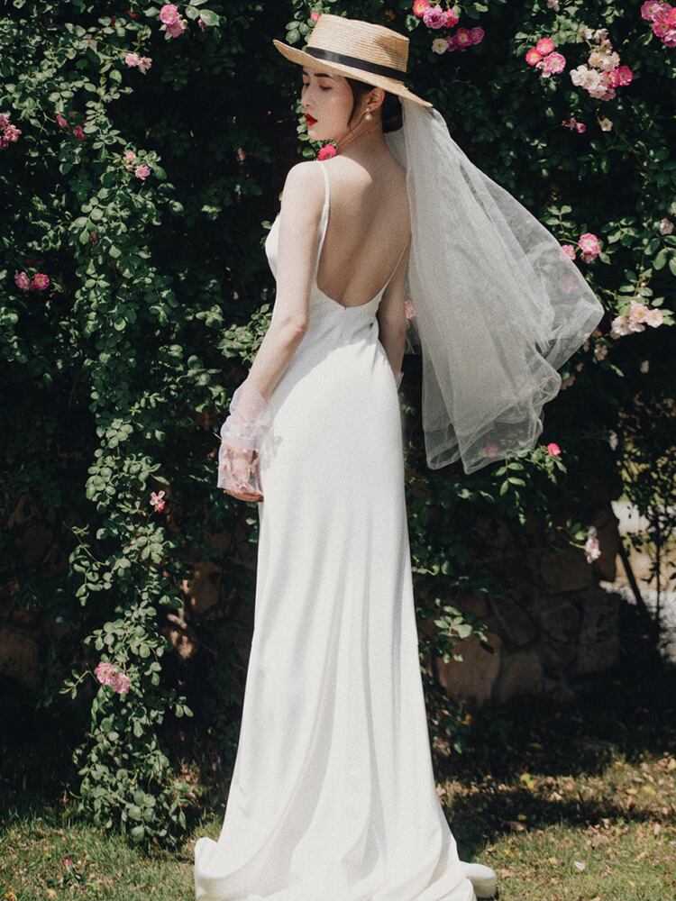 パーティードレス ホワイト フランス風 キャミソール 背中見せ スレンダーライン お呼ばれ/パーティー