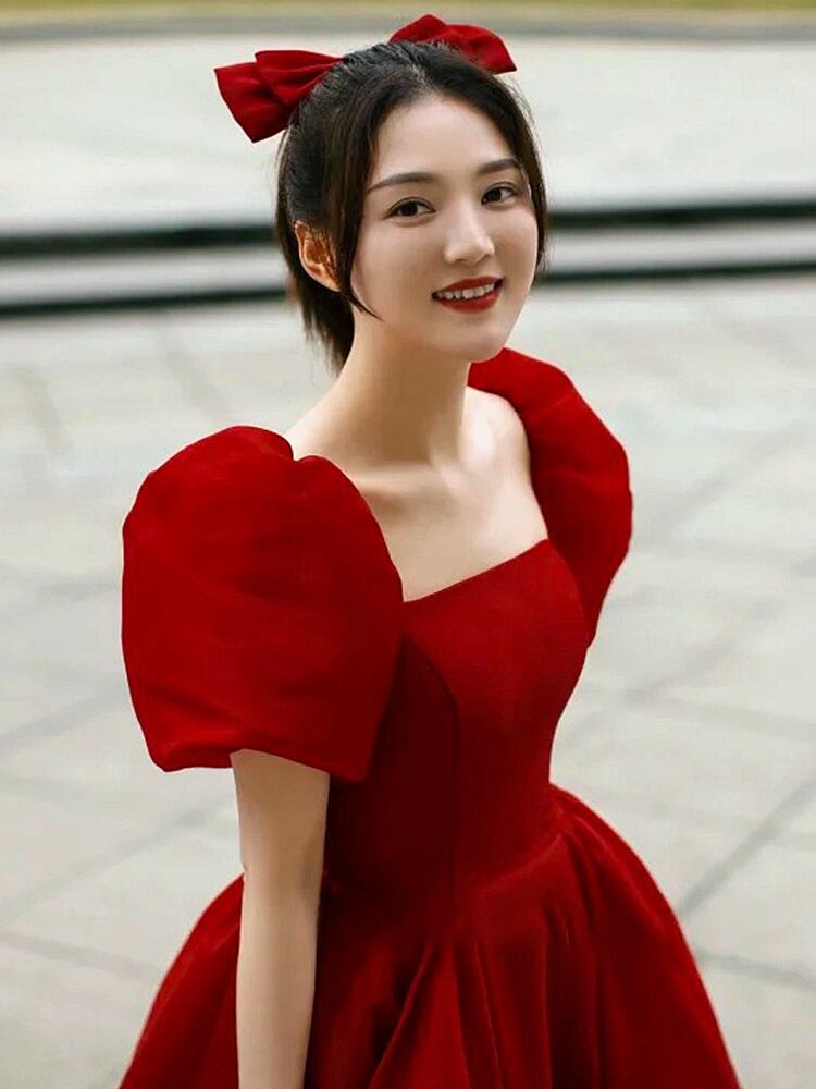ウェディングドレス 赤 プリンセスライン スクエアネック パフスリーブ 披露宴/ お呼ばれ/二次会