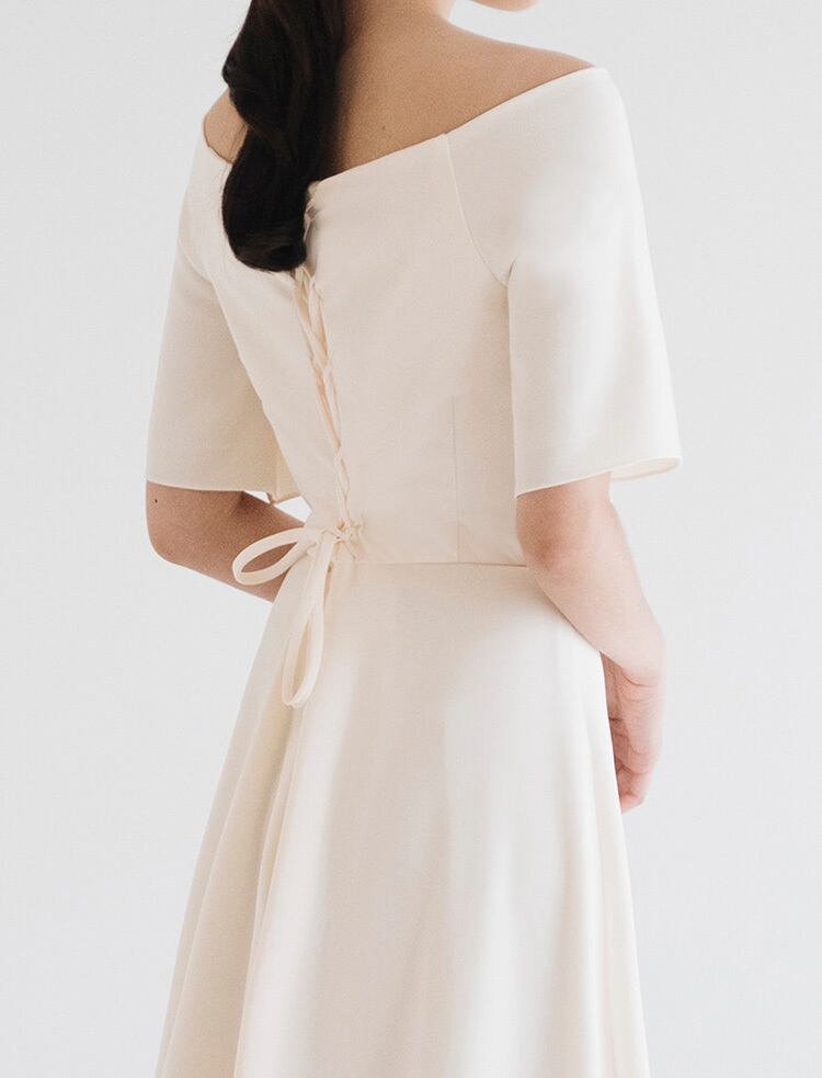 パーティードレス ホワイト ミカドサテン スレンダーライン オフシェル 披露宴/ お呼ばれ