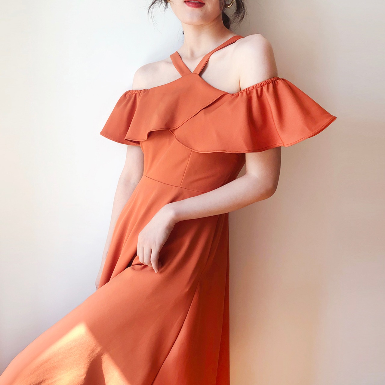 パーティードレス ワンピース ピンク/グリーン /ホワイト ホルターネック フリル袖 オフシェル Aライン 合コン/デート/パーティー
