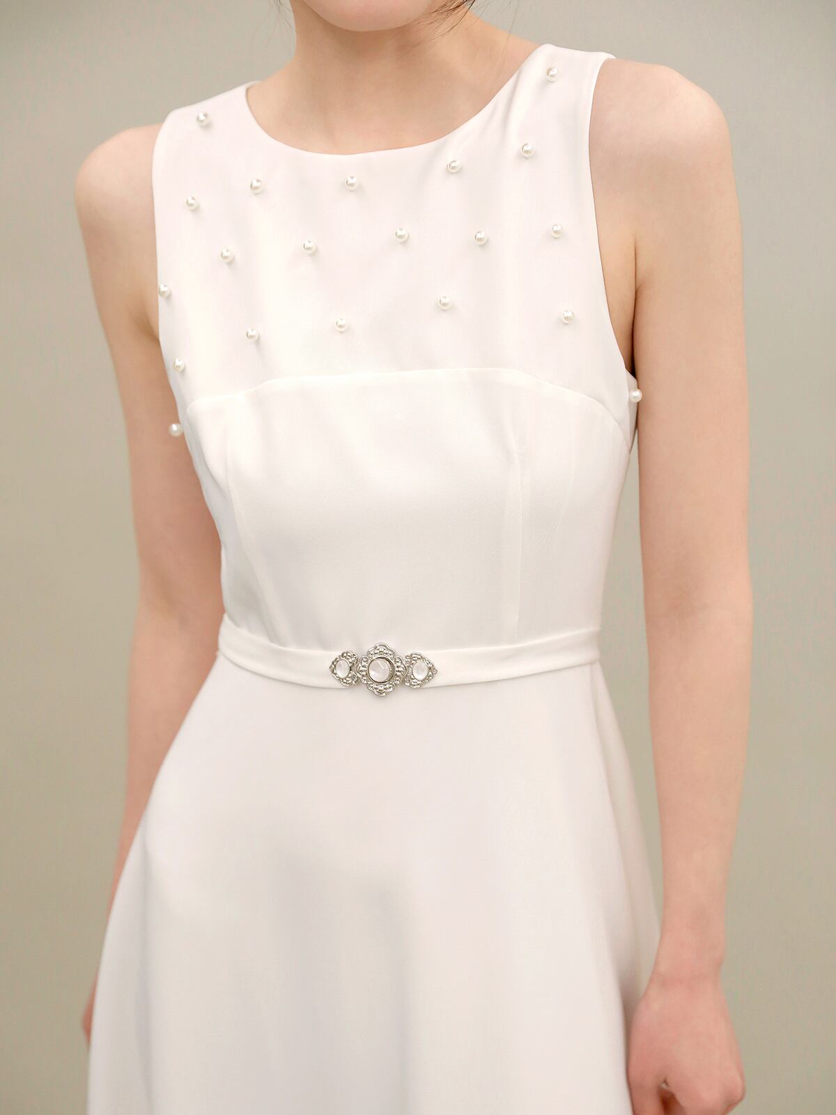 パーティードレス ホワイト ノースリーブ リボン ラウンドネック スレンダーライン 2次会/合コン/デート