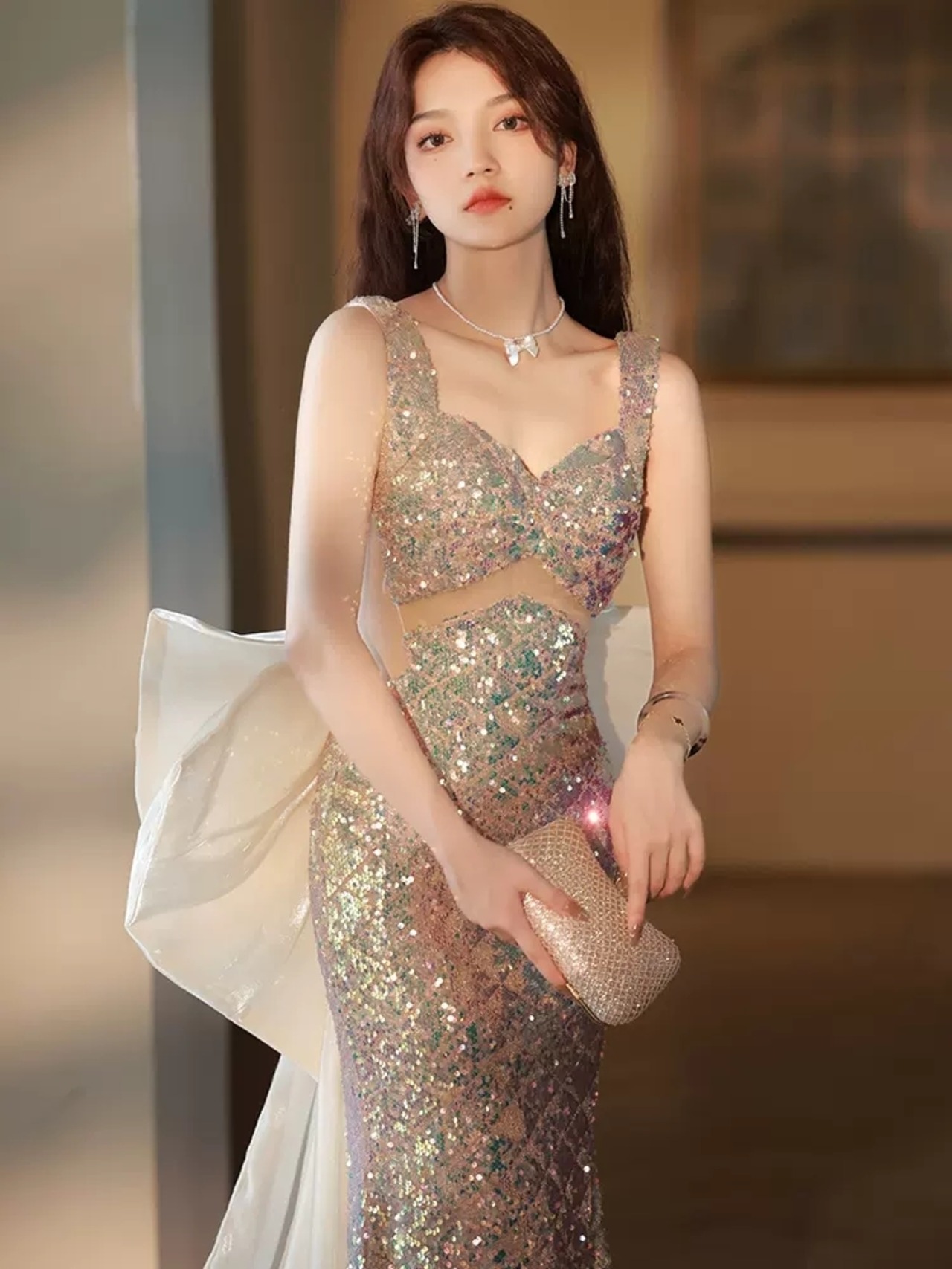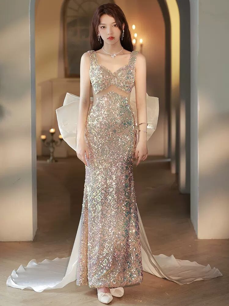 パーティードレス 薄シャンパンの色 キラキラスパンコール ノースリーブ スクエアネック リボン お呼ばれ/二次会