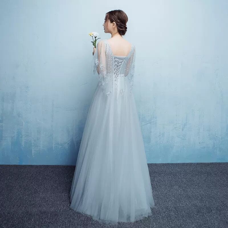 パーティードレス シルバー 半袖 編み上げ ラウンドネック 上品透け袖 優雅なシルエット 合コン/デート