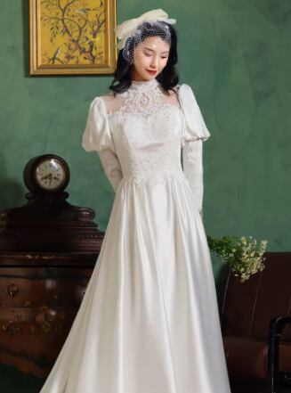 ウェディングドレス ホワイト ミカドサテン レース 長袖 華やか 短トレーン 結婚式/お呼ばれ/二次会