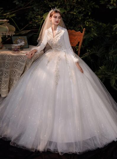 ウェディングドレス ホワイト 憧れのドレス 花柄のモチーフ刺繍が美しく 長袖 Vネック 編み上げ 花嫁