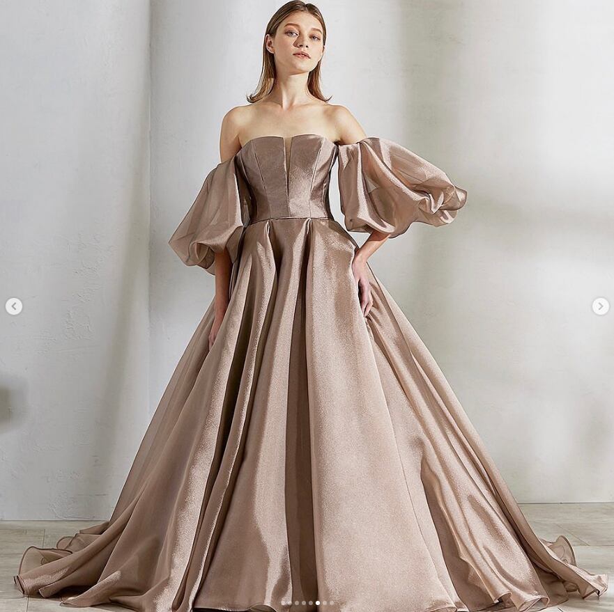 ウェディングドレス シャンパン色 人気上昇!プリンセスライン オフシェル 背中見せ 披露宴/ お呼ばれ/二次会