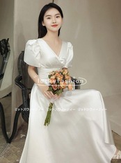 パーティードレス ホワイト Vネック パフスリーブ ワンピース スレンダーライン 合コン/デート
