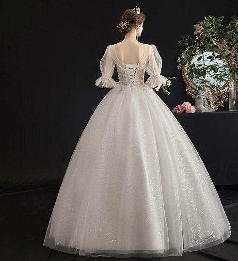 ウェディングドレス ホワイト 花柄のモチーフ刺繍が美しく パフスリーブ クラシック風 花嫁/ウェディングドレス