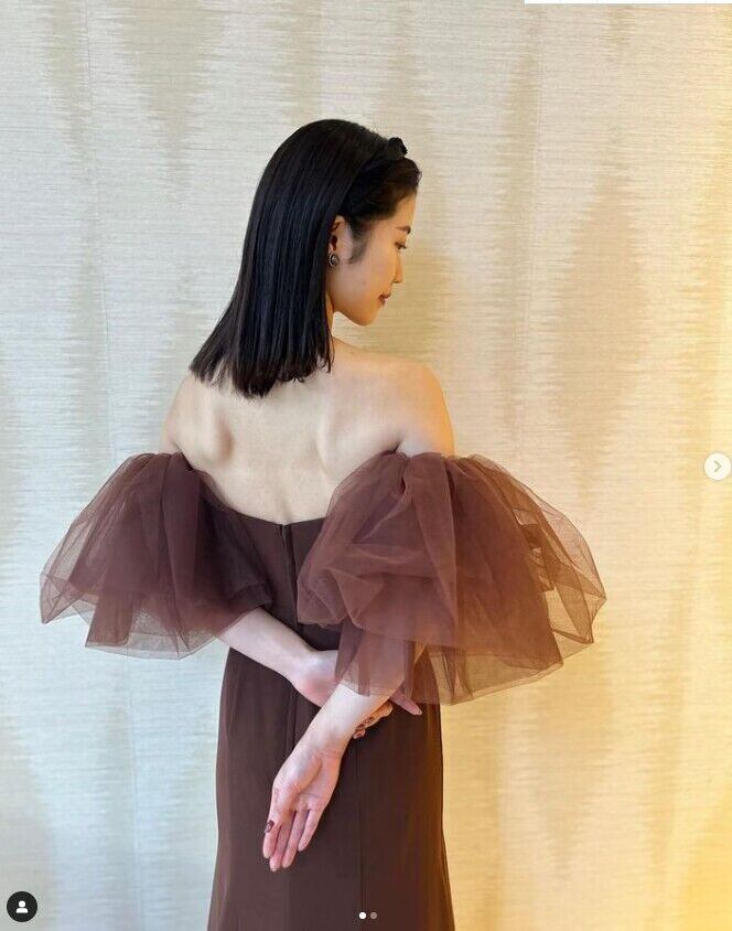 新品ウェディングドレス から茶色 細見えシルエット オフショルダー ふわふわ袖 披露宴/ お呼ばれ/二次会