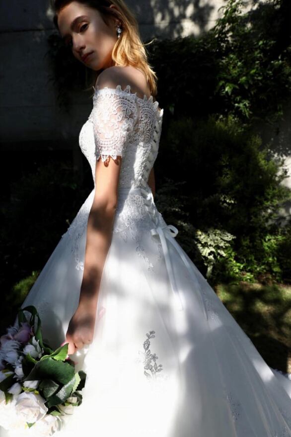 ウェディングドレス ホワイト 花柄のモチーフ刺繍が美しく オフシェル 編み上げ ロングトレーン 結婚式/披露宴